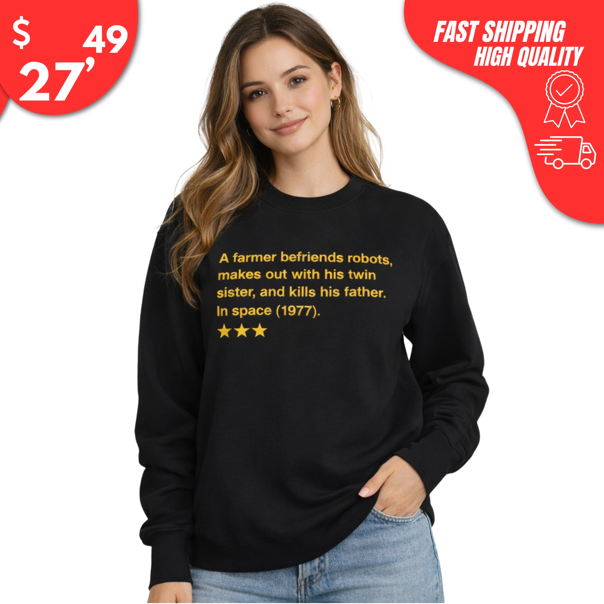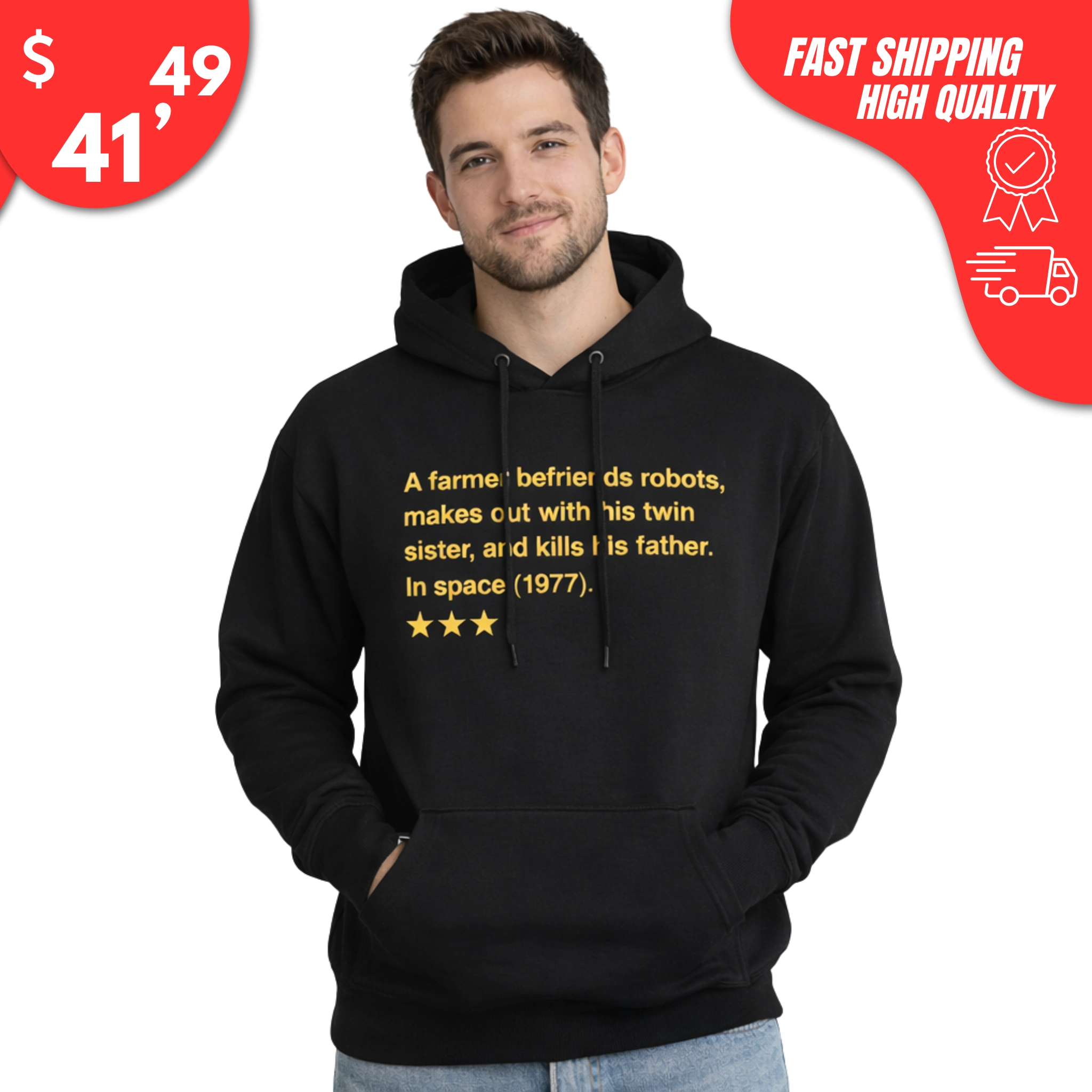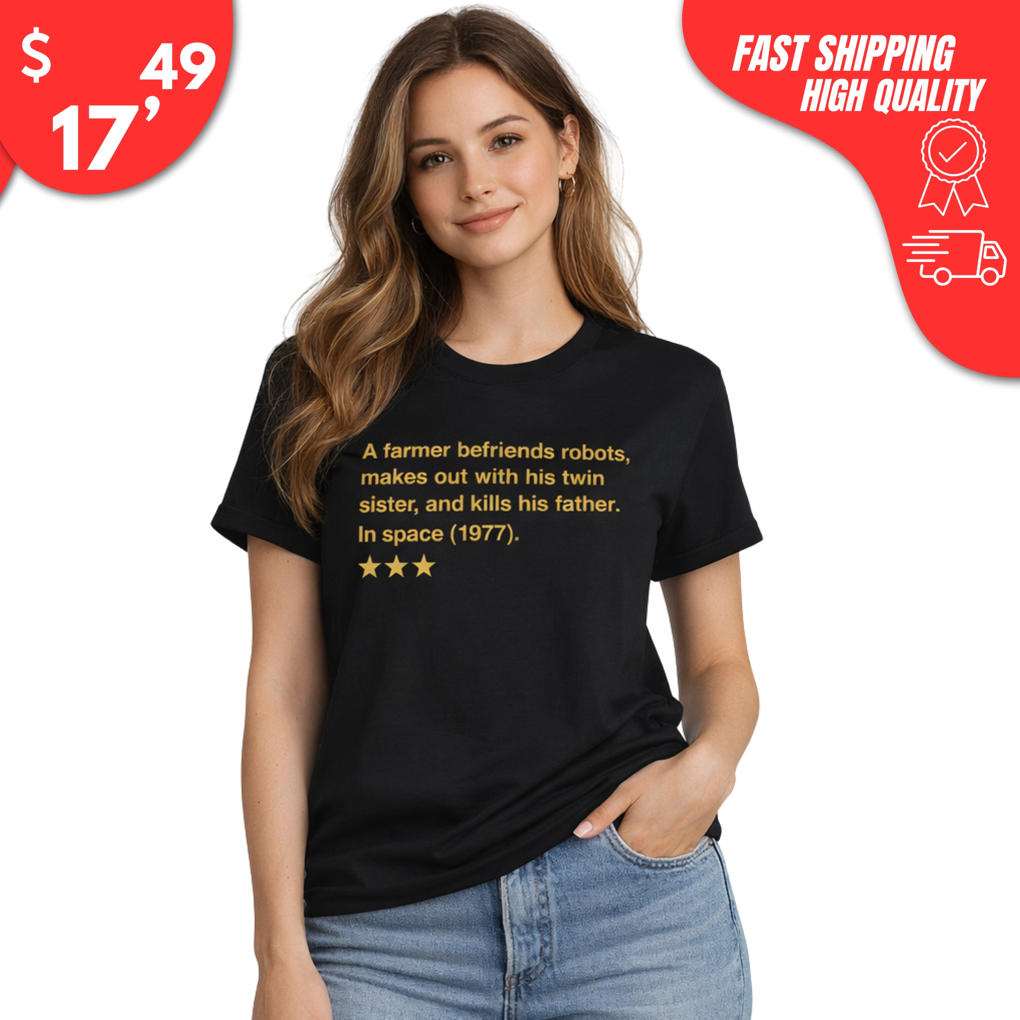 With a comfortable unisex fit and bold text, the A Farmer Befriends Robots Makes Out With His Twin Sister and Kills His Father in Space 1977 Shirt is perfect for movie nights, fan conventions, watch parties, or everyday wear that’ll make people do a double-take.