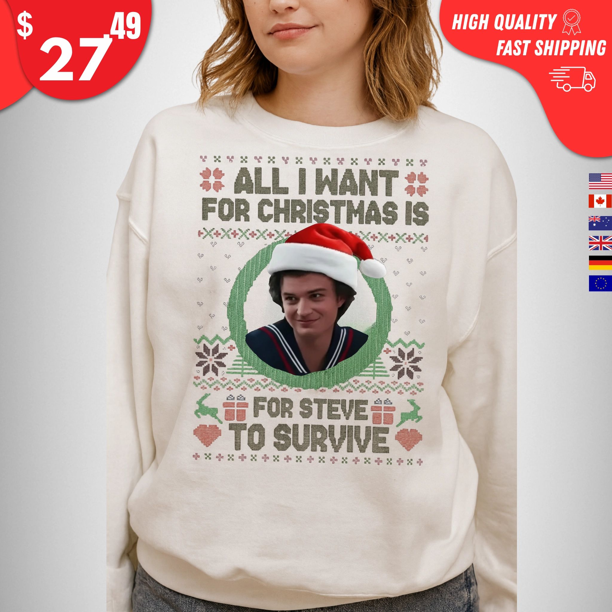 Funny “All I Want For Christmas Is Steve To Survive” slogan for Stranger Things fans