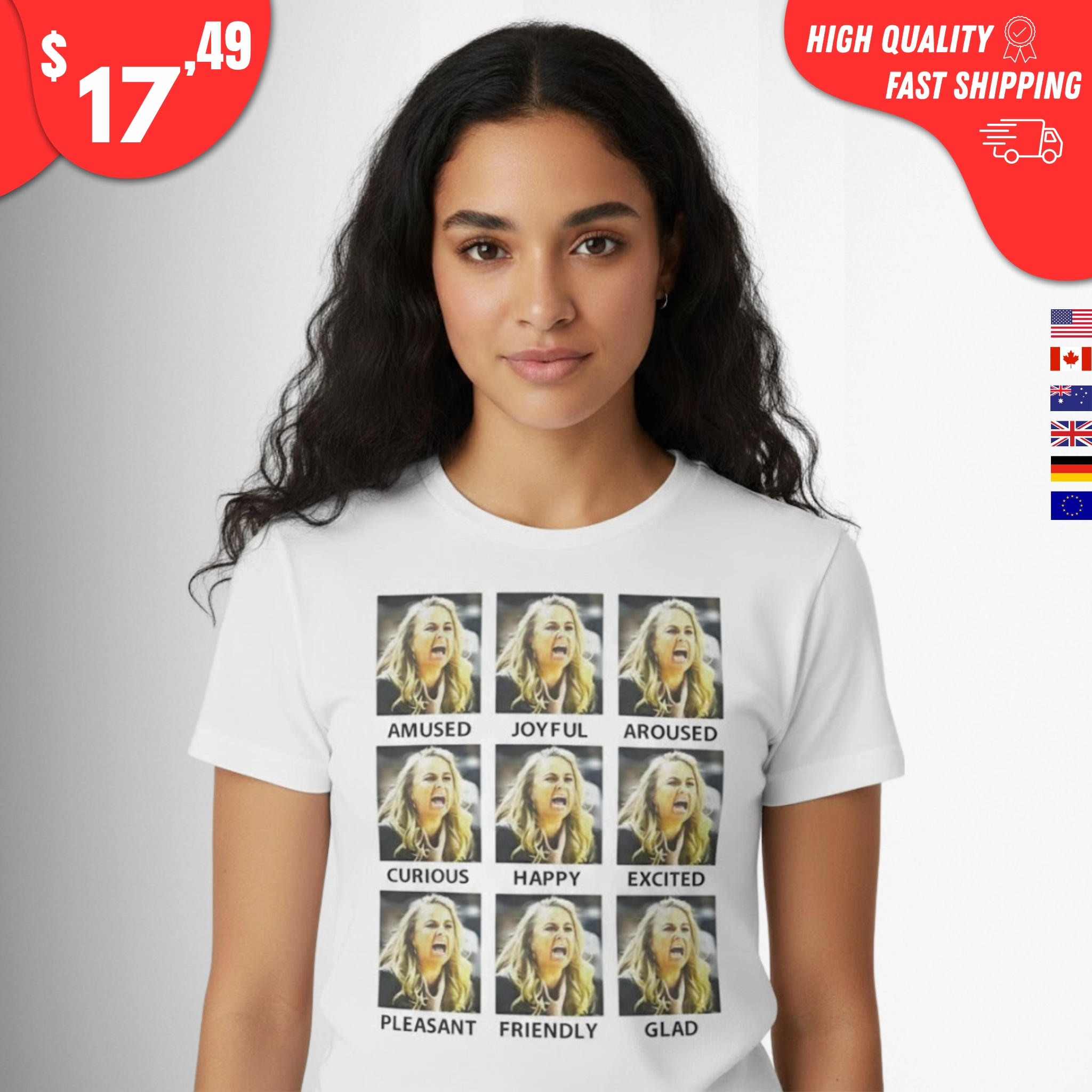 Bring the energy of every emotion (and none at all) with the Becky Hammon Amused Joyful Aroused Curious Happy Excited Shirt. Featuring nine identical shots of the legendary coach mid-game — each hilariously labeled with a different emotion — this tee captures the intensity, passion, and meme-worthy moments that make Becky Hammon a fan favorite.