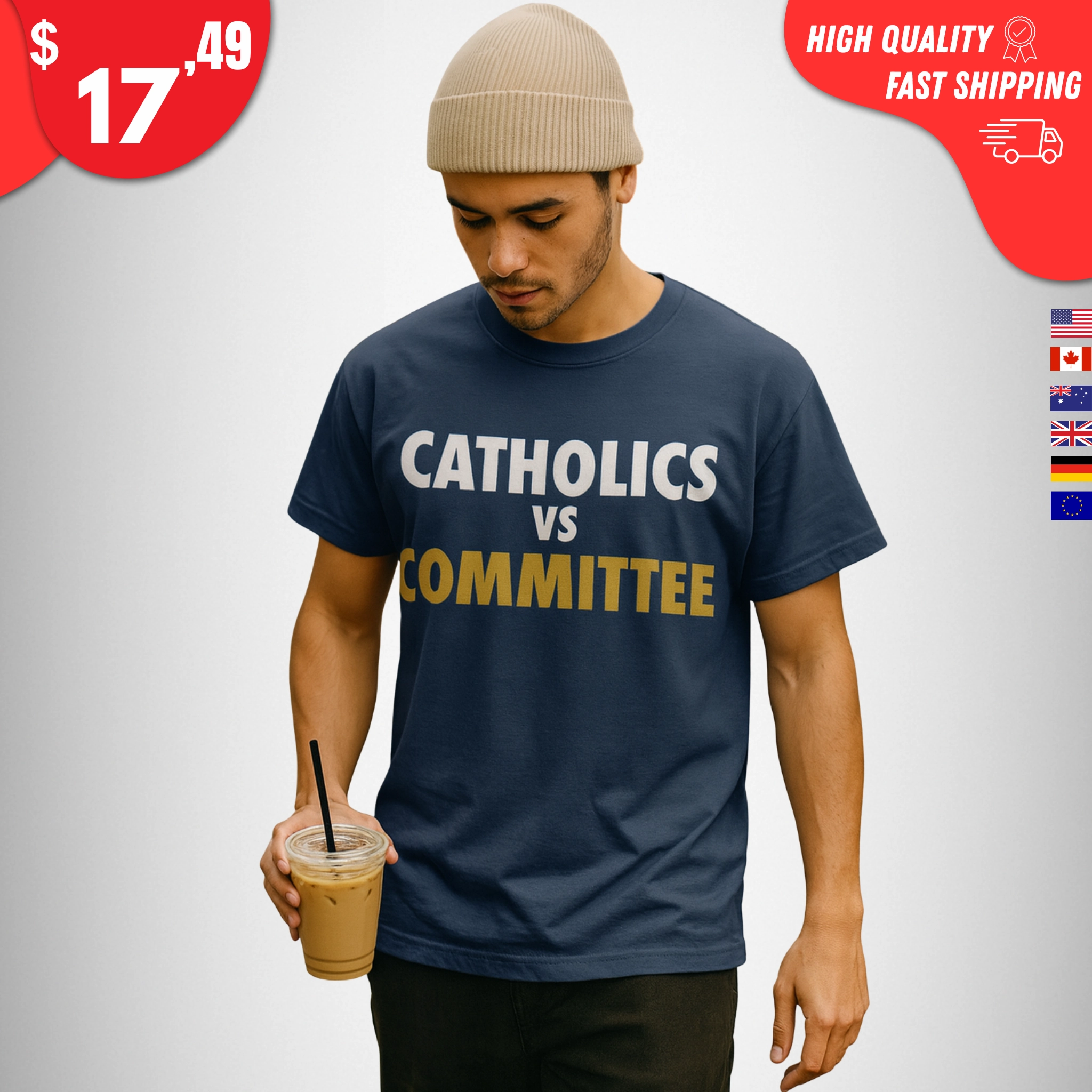 Fun “Catholics vs Committee” slogan that riffs on classic rivalry shirts