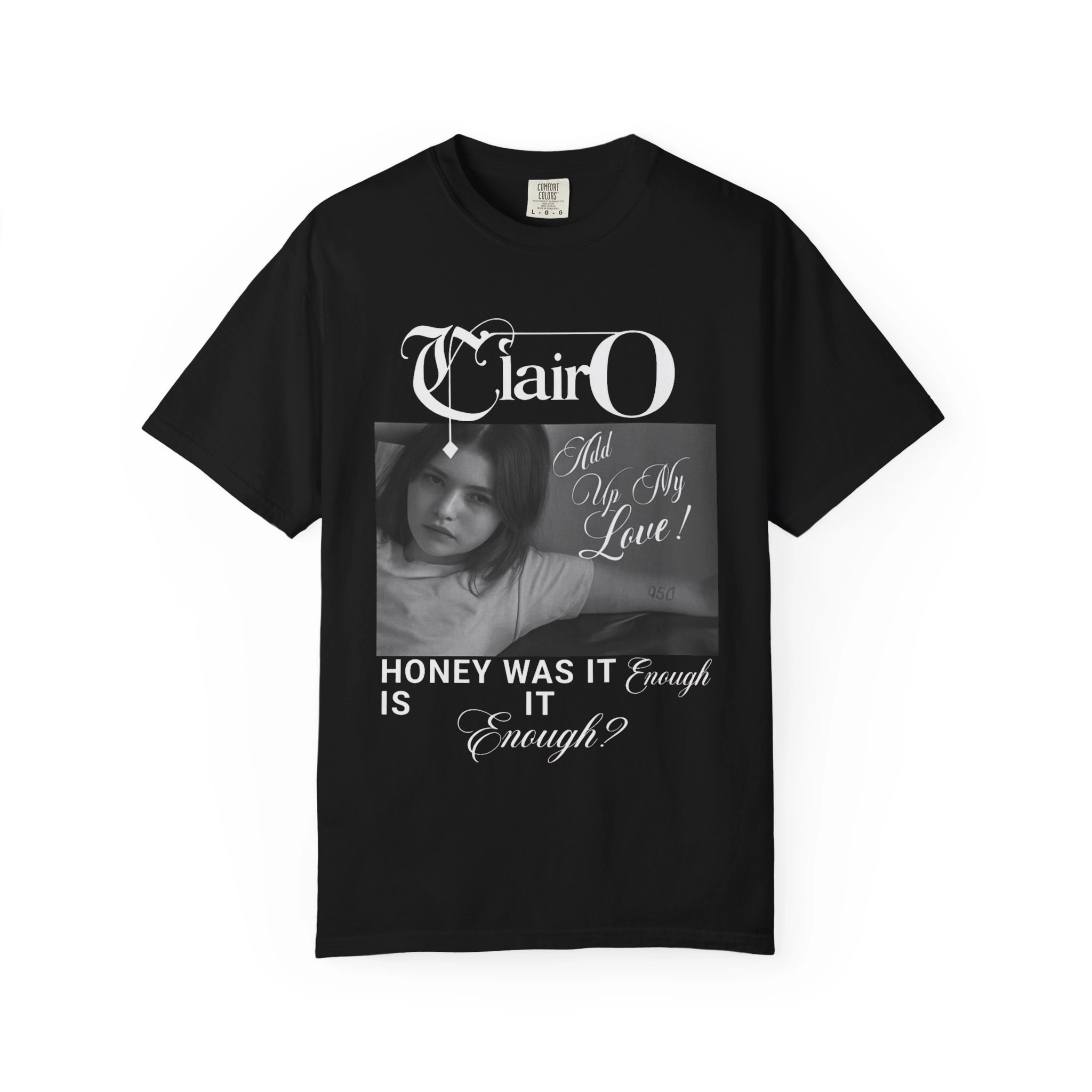 This shirt captures the moody tenderness of Clairo’s music and visual style. Featuring a striking monochrome portrait and the haunting phrase “Add Up My Love,” it brings that bedroom-pop vulnerability straight to your closet. With text that reads “Honey, was it enough? Is it enough?”, it’s not just fashion—it’s a feeling.