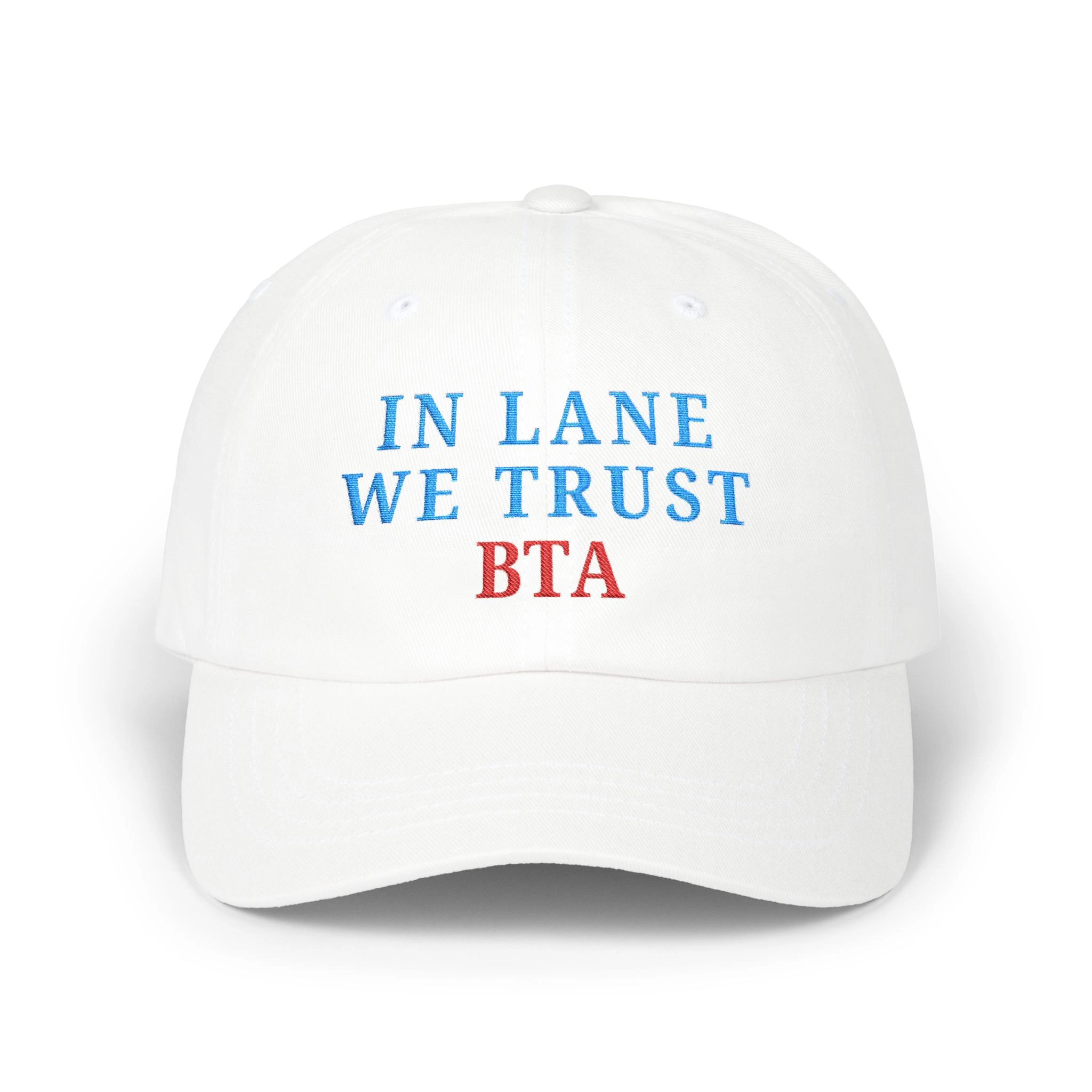 Crafted with premium cotton and a structured fit, it features bold embroidered lettering “In Lane We Trust” across the front and a clean BTA logo on the side — giving you that sharp, confident look that turns heads.