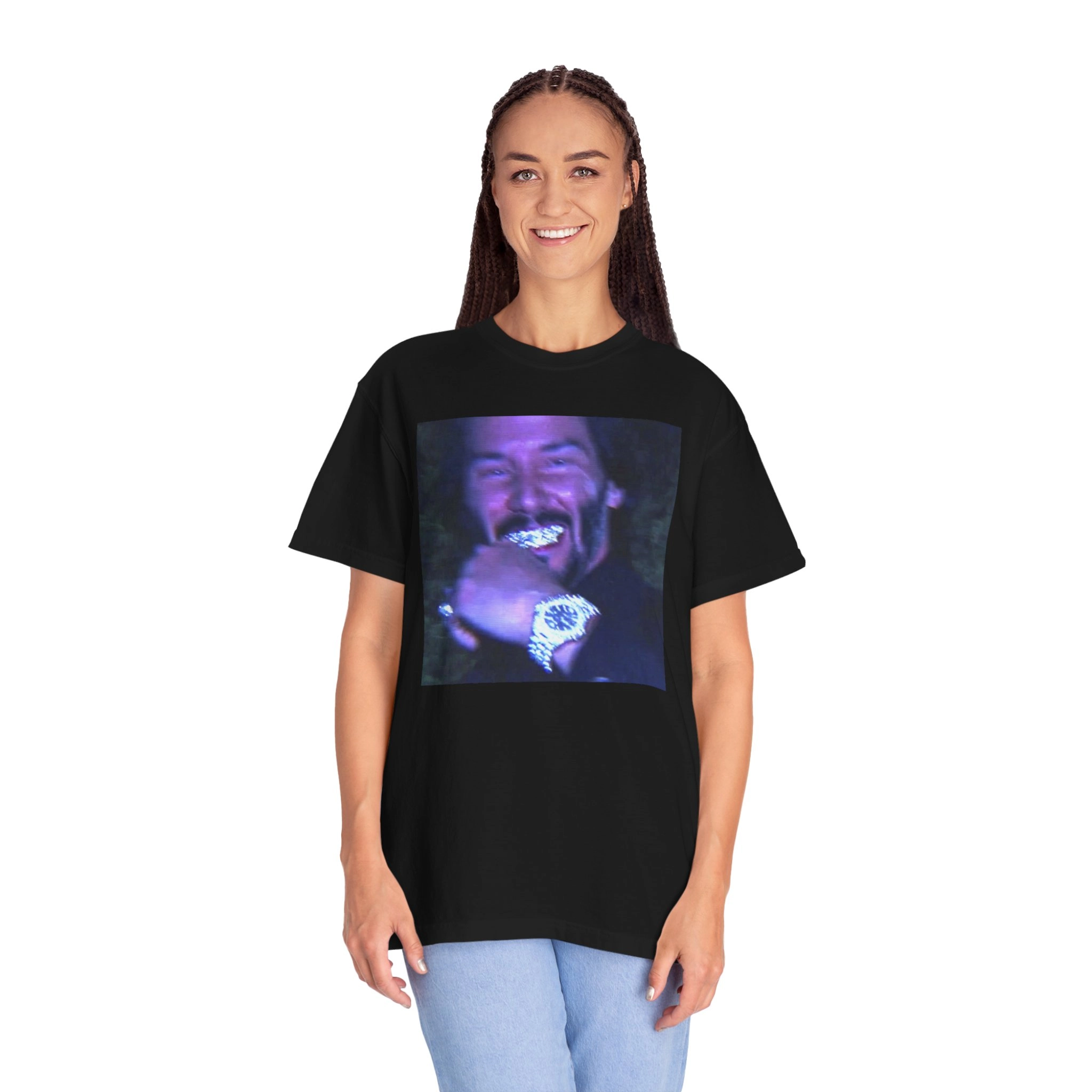 This tee features a hilariously stylish take on the iconic hitman, decked out in diamonds, shades, and that signature stone-cold stare. It’s the mashup you didn’t know you needed—John Wick, but make it fashion. The design is dripping harder than his body count.