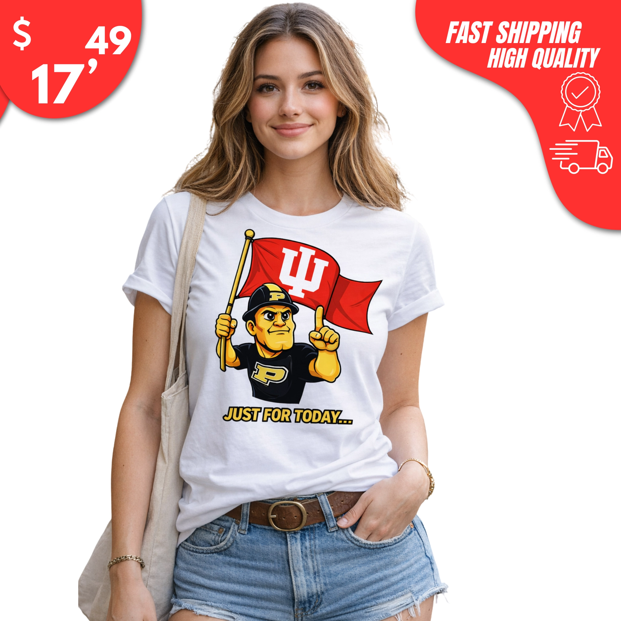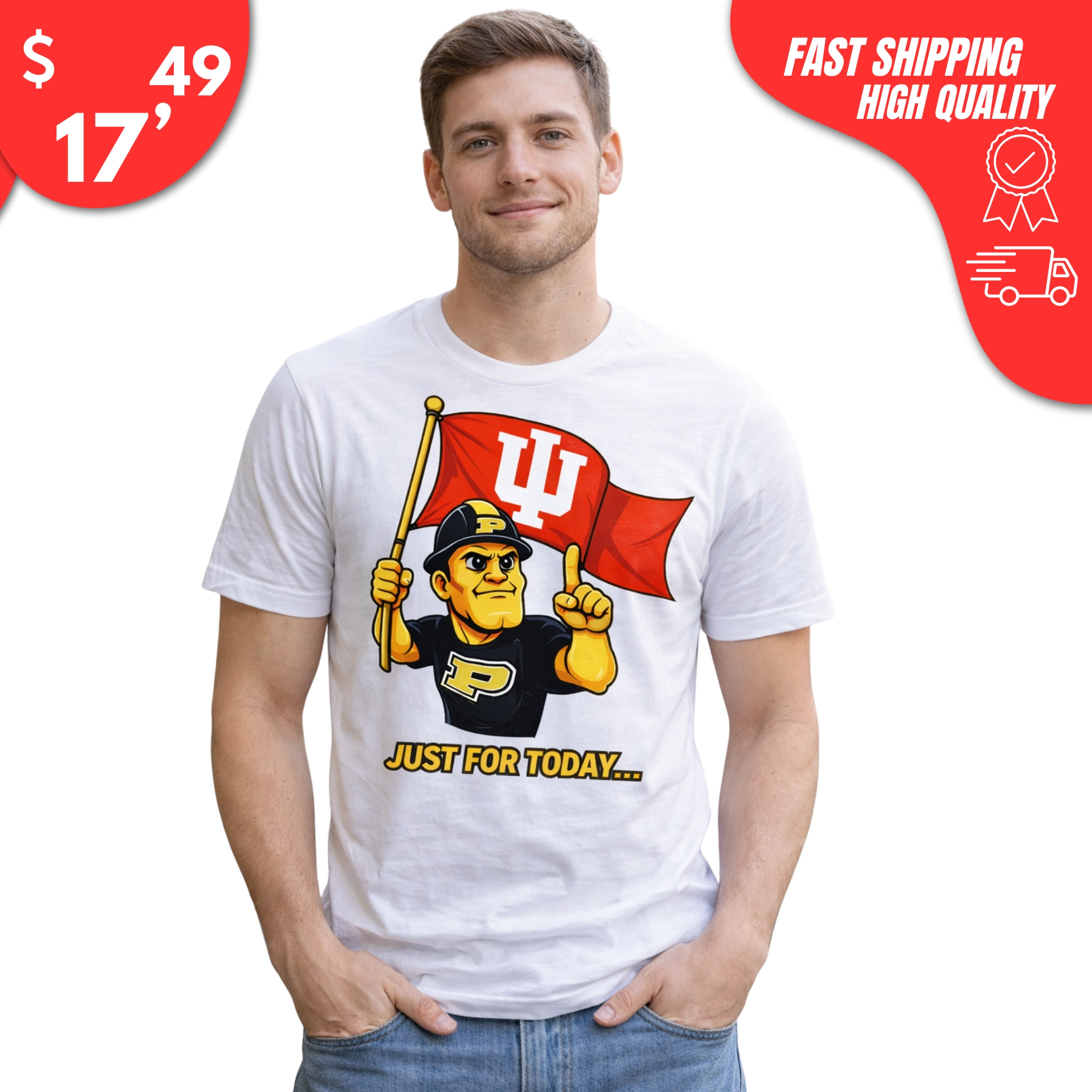 The Just For Today Indiana Pacers Shirt is made for Indiana basketball fans who understand rivalry humor and temporary alliances. Featuring a bold cartoon-style character holding an IU flag with the phrase “Just For Today…”, this shirt perfectly captures those moments when rival lines blur for the sake of the bigger picture.
