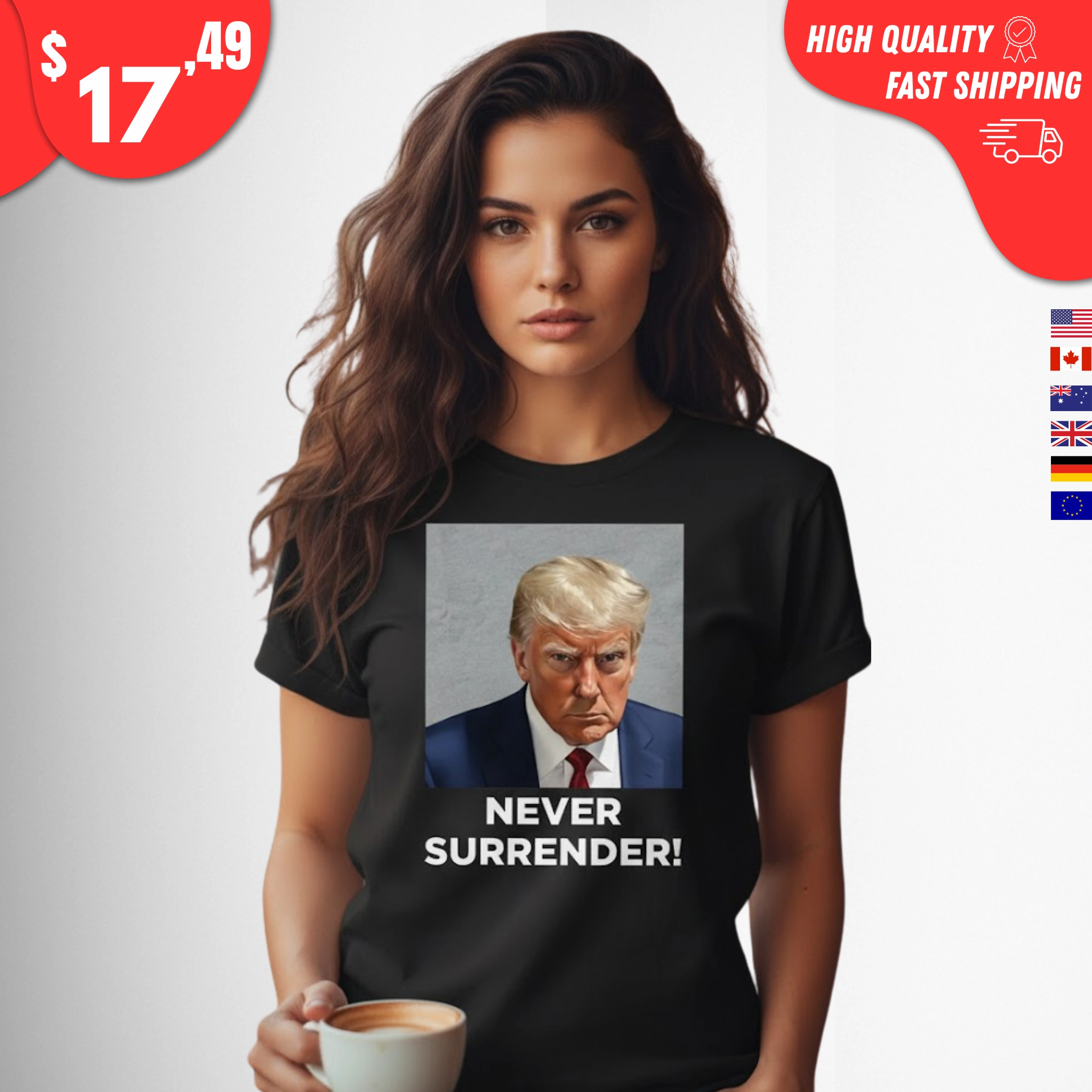 Features Trump’s iconic “Never Surrender” mugshot design