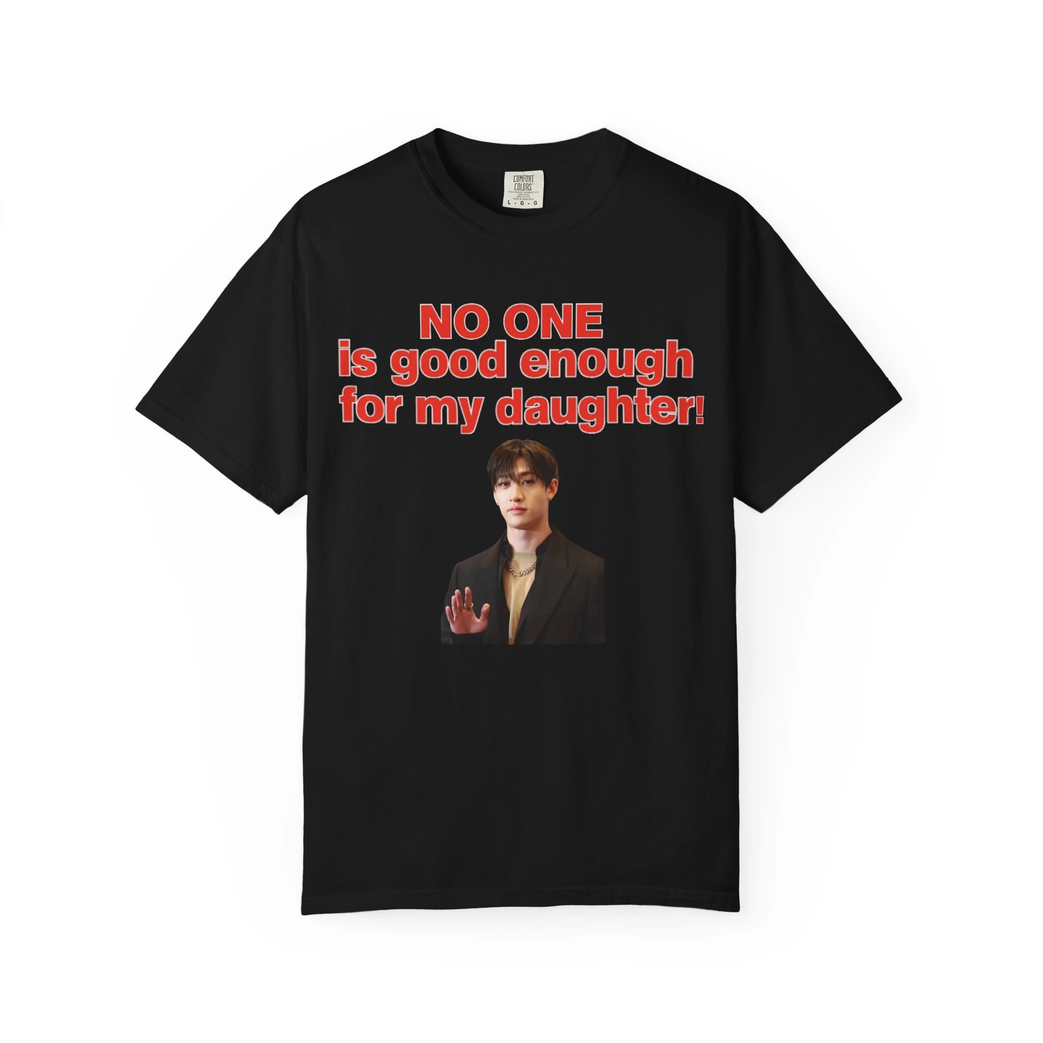 Let’s face it – the dating pool doesn’t stand a chance when you’ve set the standard at “Bang Chan.” Whether it’s the voice, the abs, the leadership, or the smile (okay, all of it), this shirt screams: “Raise your game or get outta here.” It’s a fun way to show love for your daughter and your bias, all in one awesome look.