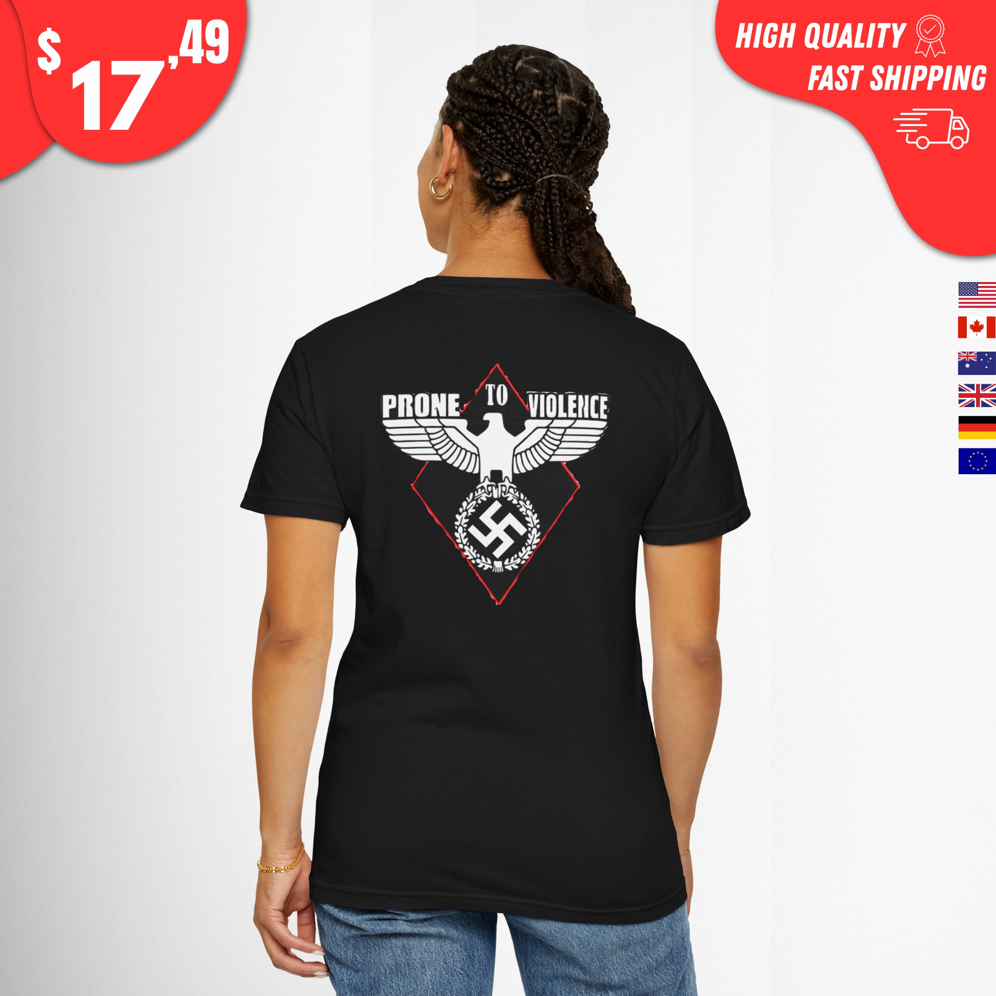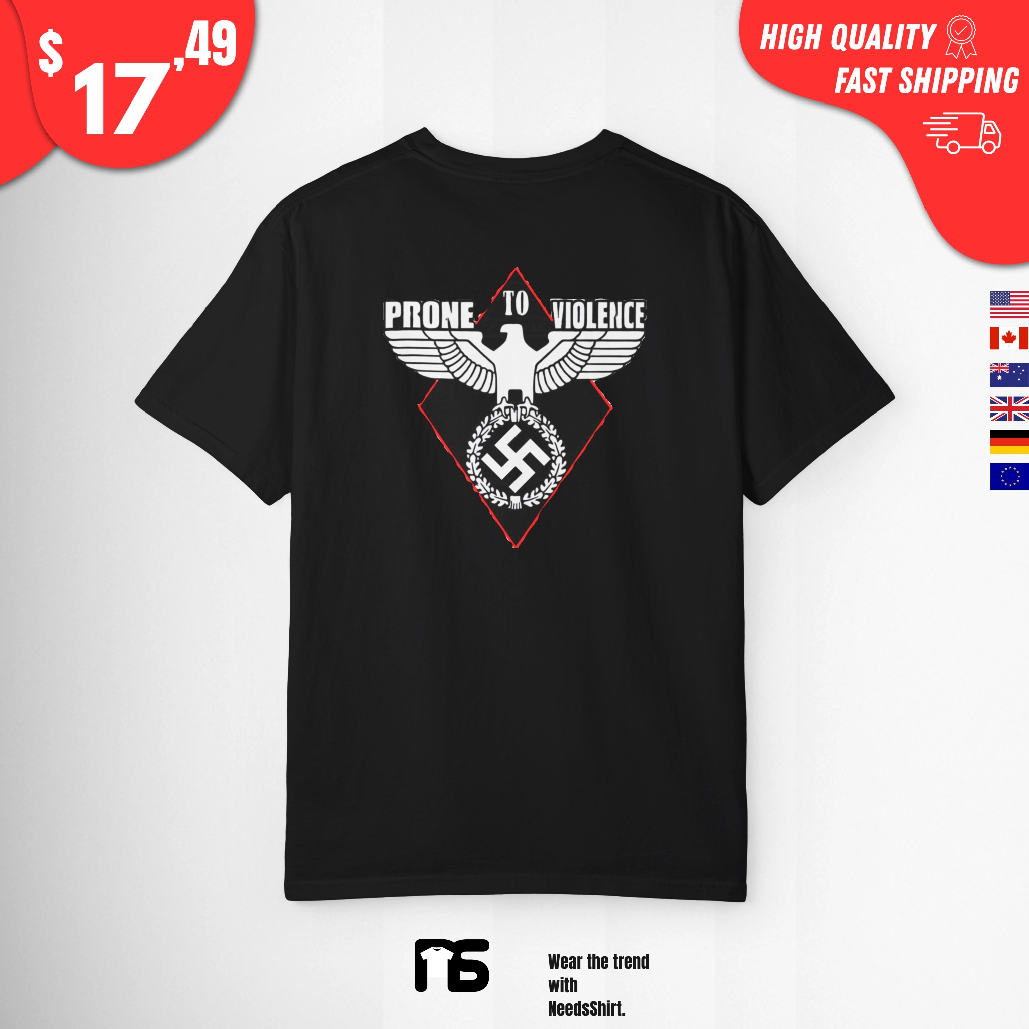 “prone to violence nazi Shirt” asked for content that promotes or glorifies an extremist ideology (Nazism) and violence.