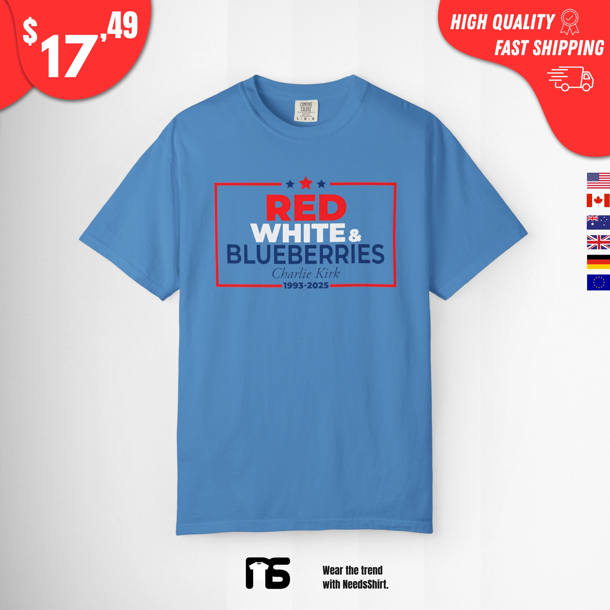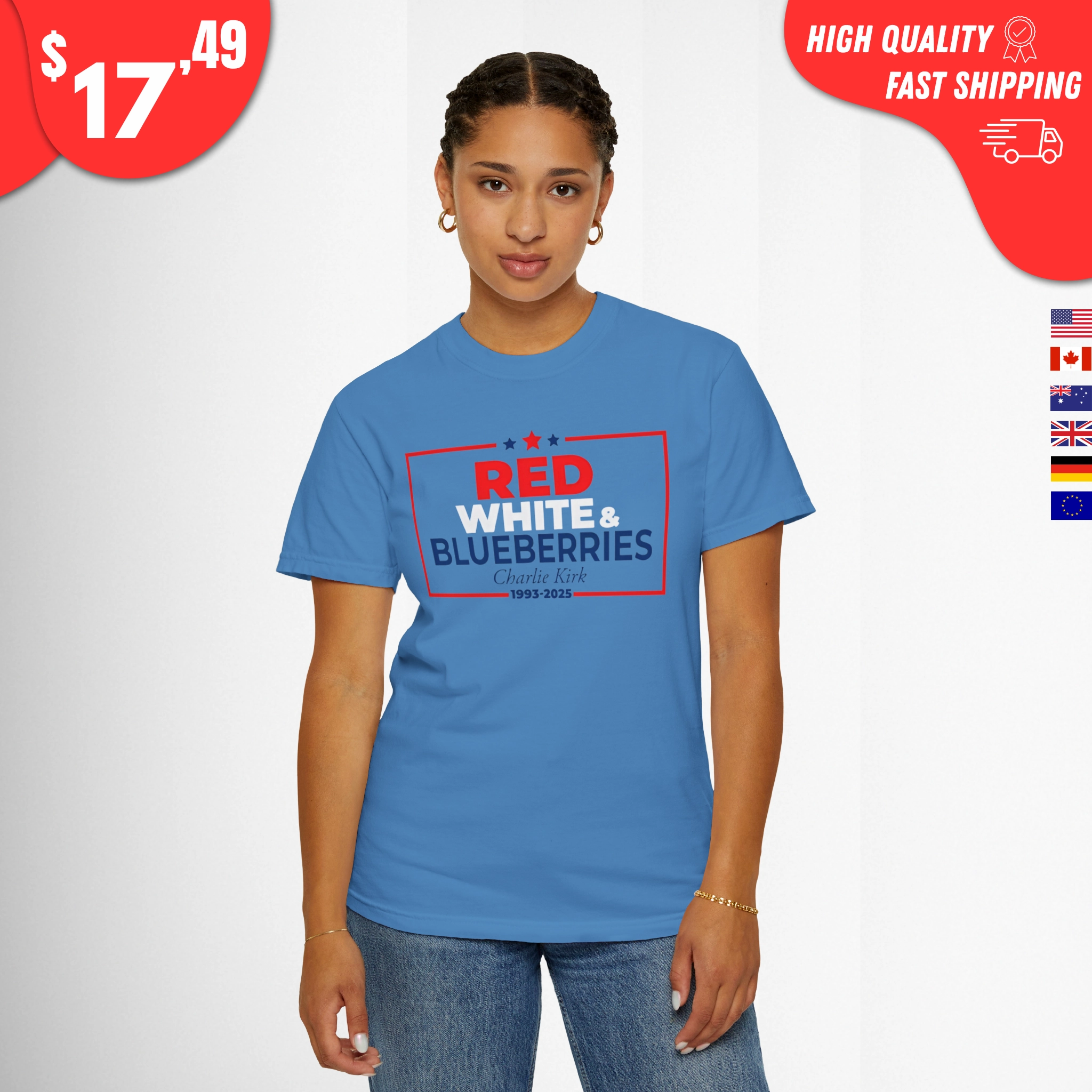 This shirt features a playful and absurd take on American pride, combining patriotic imagery with a nod to conservative commentator Charlie Kirk—because nothing says “USA” like red, white, and… blueberries?